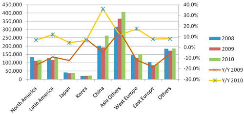 圖一 : 不同地區(qū)的手機出貨量與年成長幅度
