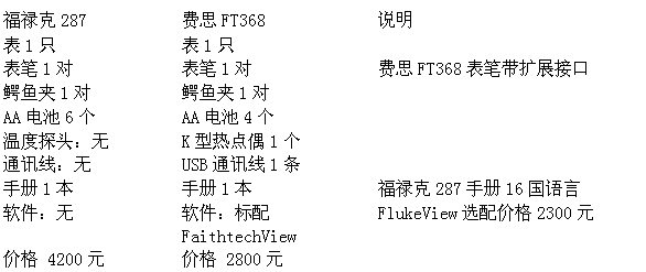 福祿克287的鱷魚夾手感好很多,比對手檔次高。費思FT368的表筆很實用和高檔,可以在其擴展接口上插測試線。另外費思FT368的K型熱點偶很正點,價值不菲。