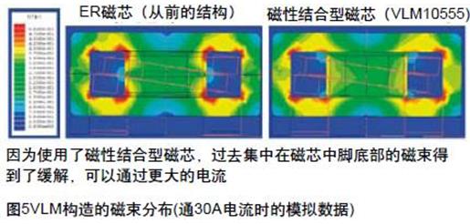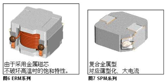 一直以來,一般的電感是以Ni-Zn系的鐵氧體作為磁芯的,這種材料雖然強(qiáng)度較高,但是飽和磁束密度較低,高溫時(shí),飽和磁束密度會降低,在電子部件驅(qū)動日趨低電壓,大電流化的今日,這類小型化產(chǎn)品無法對應(yīng)大電流。要在高溫環(huán)境下通過更大的電流,就要使用由飽和磁束密度高且損耗小的Mn-Zn鐵氧體磁芯構(gòu)成的電感。一般而言,Mn-Zn鐵氧體材料的電感,磁芯的中腳部分會形成Gap,磁芯的中腳部分開始較容易飽和。如圖4 VLM所示,結(jié)構(gòu)是由口字形磁芯(磁性結(jié)合型磁芯)和棒狀磁芯組成。采用了這種構(gòu)造后,將本來容易產(chǎn)生飽和的中心磁芯的中腳部分分成上下兩部分,在上下根部形成Gap,不易出現(xiàn)部分飽和,能夠容許更大電流通過。另外,由于Gap分散在卷線的上下兩端,可以減少從Gap泄漏的磁束對卷線的影響。過電流損失減少,電源效率也提高了。再者,還可使用金屬磁芯的電感。它的飽和磁束密度更高,受溫度影響飽和電流的變化很少。如圖6 ERM6050所示。金屬磁芯的電感還有另外一款復(fù)合金屬型的電感(圖7 SPM系列)。