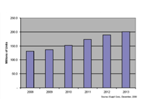 相對(duì)于2009年出貨量可能持平甚至下降的其他電子產(chǎn)品,例如2009年GPS便攜式導(dǎo)航設(shè)備市場(chǎng)可能會(huì)收縮0.7%,估計(jì)達(dá)4.2%的機(jī)頂盒市場(chǎng)年增長(zhǎng)率可以說(shuō)相對(duì)健康。對(duì)于未來(lái),iSuppli公司仍認(rèn)為機(jī)頂盒市場(chǎng)將繼續(xù)穩(wěn)步增長(zhǎng),2008-2013年的復(fù)合年增長(zhǎng)率將達(dá)8.9%。