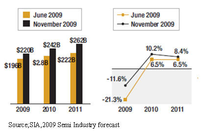 然而最新的預(yù)測(cè)調(diào)整為2009年全球半導(dǎo)體業(yè)僅下降11.6%,為2197億美元,但是對(duì)于2010年修正為增長(zhǎng)10.2%,達(dá)2421億美元,及2011年增長(zhǎng)8.4%,達(dá)2623億美元。