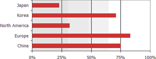 圖一 在32到42吋電視中采用USB playback的滲透率(按不同地區(qū)分布)