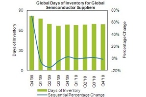 整個2010年的DOI預(yù)計穩(wěn)定在接近70天的水平。半導(dǎo)體供應(yīng)商打算在這一年中的四個季度都能保存庫存需求的平衡。