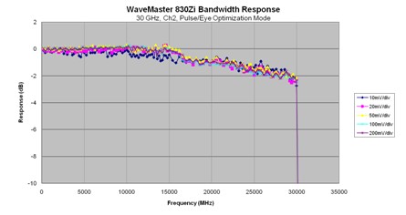 對(duì)脈沖信號(hào)進(jìn)行精確測(cè)量,除了要求示波器有足夠的帶寬以外,還要求示波器通道的頻響曲線在不同垂直刻度設(shè)置下有良好的 穩(wěn)定度及一致性。力科8Zi系列示波器不但在帶寬上做到了業(yè)界最高的30Ghz,在示波器頻響方面也同樣做到了業(yè)界最優(yōu),從而在硬件上奠定了對(duì)脈沖信號(hào)進(jìn)行精確測(cè)量的基礎(chǔ)。下圖二為力科Wavemaster830Zi示波器在不同垂直刻度下的實(shí)測(cè)頻響曲線,我們可以看到,各條曲線在示波器的全帶寬范圍內(nèi)均保持了良好的穩(wěn)定度與一致性。