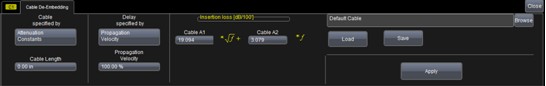 在使用示波器結(jié)合同軸電纜測(cè)量脈沖信號(hào)時(shí),為保證測(cè)量的精確性與一致性,必須去除電纜的效應(yīng)。力科WaveMaster8Zi系列示波器擁有電纜去嵌(cable de-embedding)功能,在每個(gè)通道中均可選擇是否激活此功能(下圖所示為cable de-embedding的操作界面)??梢允褂脙煞N方法來輸入電纜的特性:一種是電纜的衰減常數(shù),包括了電纜長(zhǎng)度、傳輸速度、插入損耗的多項(xiàng)式系數(shù);另一種是直接輸入多個(gè)頻率點(diǎn)的插入損耗(即S參數(shù)的S21)。電纜的特性參數(shù)可以從電纜廠商處獲得,或者使用TDR或矢量網(wǎng)絡(luò)分析儀測(cè)量。