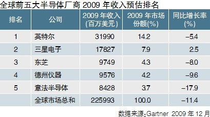 根據(jù)市場調(diào)研公司Gartner的估計(jì),2009年全球半導(dǎo)體行業(yè)總收入為2.26億美元,同比下滑11.4%,這將是該行業(yè)25年來經(jīng)歷的第六次收入下滑。 Gartner分析稱,個(gè)人電腦市場是最先反彈的市場,隨后是手機(jī)、汽車等市場開始反彈。此外,盡管收入下滑,英特爾仍連續(xù)18年蟬聯(lián)年收入額第一,2009年,該公司的市場份額增加到14.2%。