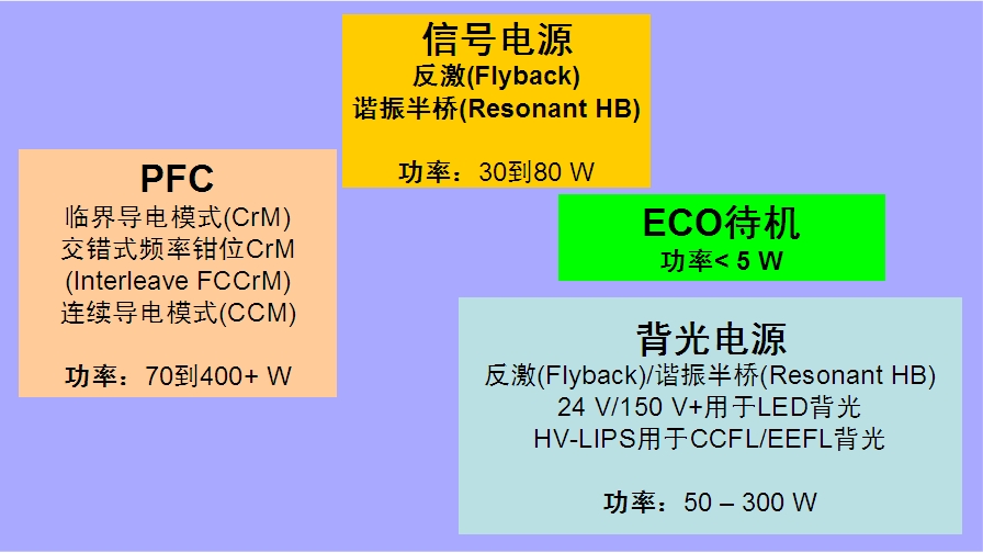 液晶電視電源包含功率因數(shù)校正(PFC)、信號(hào)電源、背光電源及ECO待機(jī)等多個(gè)組成部分,不同部分往往包含不同的架構(gòu)可供選擇,參見(jiàn)圖1。以PFC段為例,可以選擇如臨界導(dǎo)電模式(CrM)、連續(xù)導(dǎo)電模式(CCM)或交錯(cuò)式頻率鉗位臨界導(dǎo)電模式(FCCrM)等不同的PFC控制器。選擇何種電源架構(gòu),需結(jié)合應(yīng)用的屏幕尺寸、功率等級(jí)及背光源等因素。另外,作為重要賣(mài)點(diǎn)的纖薄設(shè)計(jì)也影響著電源方案的選擇。