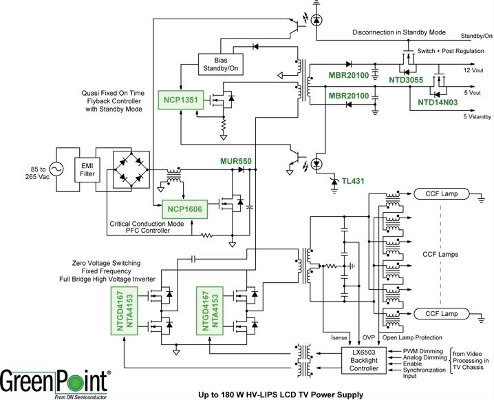 例如,目前市場(chǎng)上銷(xiāo)量最大的是32英寸液晶電視。在這類(lèi)液晶電視中,采用標(biāo)準(zhǔn)24 V逆變器電源的方案在市場(chǎng)上仍占據(jù)多數(shù),但新興的高壓液晶電視集成電源(HV-LIPS)的應(yīng)用也在不斷增多,總體上呈現(xiàn)出并存的態(tài)勢(shì)。采用標(biāo)準(zhǔn)24 V逆變器的傳統(tǒng)液晶電視在接受110/220 Vac市電輸入后,經(jīng)過(guò)整流、PFC及濾波,轉(zhuǎn)換為200/400 Vdc的直流高壓。由于傳統(tǒng)高壓逆變器的輸入電壓要求是24 Vdc,故PFC的輸出電壓200/400 Vdc會(huì)經(jīng)過(guò)降壓轉(zhuǎn)換,產(chǎn)生多路輸出電壓,其中一路24 Vdc電壓提供給高壓逆變器,再經(jīng)過(guò)DC-AC轉(zhuǎn)換為超過(guò)1,000 V甚至達(dá)2,000 V的交流高壓,去驅(qū)動(dòng)液晶面板的CCFL陣列。安森美半導(dǎo)體為這類(lèi)傳統(tǒng)液晶電視推出了220 W液晶電視電源GreenPoint參考設(shè)計(jì),其中采用的關(guān)鍵元器件包括NCP1606 CrM PFC控制器、NCP1396諧振半橋控制器及NCP1027待機(jī)控制器等。