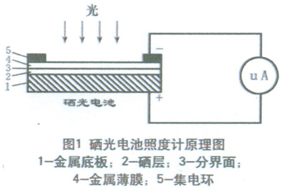 測(cè)量照度的儀器是照度計(jì),或稱勒克斯計(jì)。照度計(jì)通常是由硒光電池或硅光電池和微安表組成,見(jiàn)圖1。硒光電池是把光能直接轉(zhuǎn)換成電能的光電元件。當(dāng)光線射到硒光電池表面時(shí),入射光透過(guò)金屬薄膜4到達(dá)半導(dǎo)體硒層2和金屬薄膜4的分界面上,在界面上產(chǎn)生光電效應(yīng)。產(chǎn)生電位差的大小與光電池受光表面上的照度有一定的比例關(guān)系。這時(shí)如果接上外電路,就會(huì)有電流通過(guò),電流值從以勒克斯(Lx)為刻度的微安表上指示出來(lái)。光電流的大小取決于入射光的強(qiáng)弱和回路中的電阻。照度計(jì)有變檔裝置,因此可以測(cè)高照度,也可以測(cè)低照度。