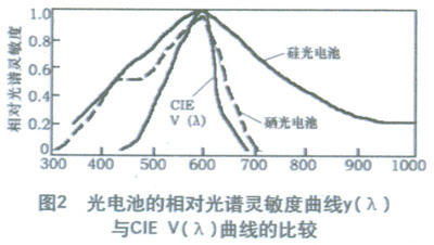 光電池的相對(duì)光譜靈敏度曲線與CIEV(λ)曲線的比較見(jiàn)圖2。
