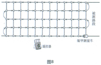 本方案是將具有記憶和存貯功能的TES—1333型照度記安置在高檔電動(dòng)遙控的履帶式玩具裝甲車(chē)(以下簡(jiǎn)稱為測(cè)試小車(chē))上,該測(cè)試小車(chē)的驅(qū)動(dòng)系統(tǒng)受站在路邊的測(cè)量者手中的遙控器和測(cè)試小車(chē)內(nèi)安置的可編程控制器為主體的自動(dòng)控制系統(tǒng)控制,當(dāng)車(chē)內(nèi)的自動(dòng)控制系統(tǒng)啟動(dòng)時(shí),裝甲車(chē)將按照事先設(shè)定的動(dòng)作程序沿如圖8所示的箭頭方向完成行走程序,并采用四點(diǎn)法在每個(gè)矩形網(wǎng)格的四角處自動(dòng)完成照度測(cè)量和記錄,存貯任務(wù),待全部程序結(jié)束后,測(cè)試小車(chē)在遙控器的操縱下自動(dòng)返回測(cè)量者所在位置。遙控器的另一作用是在車(chē)內(nèi)控制系統(tǒng)失靈的情況下,由測(cè)量者手動(dòng)遙控完成全部的測(cè)量過(guò)程,并在道路出現(xiàn)行駛車(chē)輛時(shí)緊急召回測(cè)試小車(chē)。