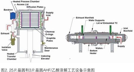 就干法清洗來說,它正用于有選擇的、大多是表面清理的步驟。例子之一是無水HF(AHF)/乙醇溶解工藝,它在多種應用中能有效地從Si表面除去本來有的或化學生成的氧化物。圖2是各種表面加工運作中執(zhí)行AHF/乙醇溶解工藝的25片晶圓和3片晶圓商品反應器的示意圖。圖3中的AFM結(jié)果說明,執(zhí)行工藝沒有損傷Si表面。