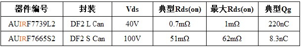 采用新款大罐式封裝的 AUIRF7739L2 具有業(yè)內(nèi)最低的導(dǎo)通電阻,在給定 PCB 區(qū)域 40V 電壓時(shí)的導(dǎo)通電阻典型值僅為 0.7mΩ 。此外,與 D2PAK 相比,大罐式封裝的占位面積可以減少60%,厚度可以降低85%。這款器件可提供卓越的功率密度和效率,非常適合高負(fù)載電機(jī)控制應(yīng)用,包括電動(dòng)助力轉(zhuǎn)向系統(tǒng) (EPS) 和微型混合動(dòng)力車的電池開(kāi)關(guān)和集成式起動(dòng)發(fā)電機(jī) (ISA) ,以及底盤、傳動(dòng)系統(tǒng)和動(dòng)力系統(tǒng)等。