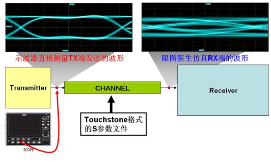 眼圖醫(yī)生(Eye Doctor)是力科于2006年推出的用于高速串行數(shù)字電路設(shè)計(jì)的強(qiáng)大工具,集成在高帶寬示波器中,包括了虛擬探測(virtual probing)與接收端均衡(receiver equalization)兩部分,主要用于通訊背板設(shè)計(jì)、高速串行信號一致性測試、高速SERDES芯片均衡器的優(yōu)化與設(shè)計(jì)等等。在2009年2月,力科發(fā)布了新一代的眼圖醫(yī)生II,提供了更強(qiáng)大的分析能力與良好人機(jī)界面。如下圖1所示,利用Eye Doctor的信道仿真功能,可以用示波器測量到的TX端發(fā)送的波形,在Eye Doctor II中導(dǎo)入信道的S參數(shù)模型文件,計(jì)算出通過信道后RX端的信號波形、眼圖與抖動,其功能類似于EDA的SI仿真工具。