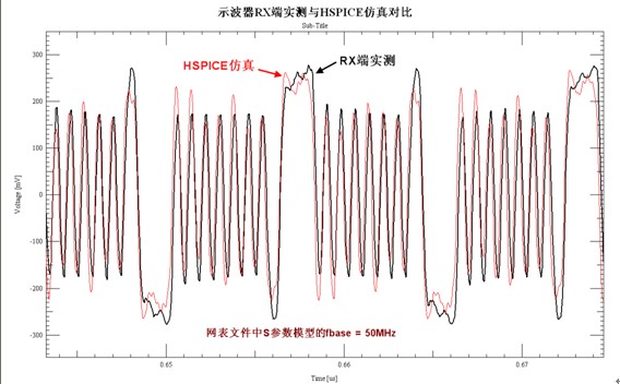 在圖9中分別為fbase=30/40/50MHz時(shí),HSPICE仿真出的接收端波形??梢钥吹絝base=50MHz時(shí),低頻的碼型(長1或長0)幅度較低些,與實(shí)測RX端波形的比較接近。在使用HSPICE仿真時(shí),fbase=50MHz時(shí)的仿真時(shí)間遠(yuǎn)小于最開始的頻率設(shè)置(fbase = 10MHz)。在圖10中,對比了fbase=50MHz時(shí)HSPICE仿真的RX端波形與實(shí)測波形,兩者一致性比較好。