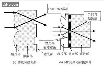 事實(shí)上早期的MD方式RP-TV都是使用CRT背投電視螢?zāi)?,因此始終無(wú)法充分發(fā)揮MD方式RP-TV的特性,有監(jiān)于此日本凸版印刷公司首度開(kāi)發(fā)如(圖五)所示MD方式RP-TV專用螢?zāi)唬蓤D可知MD方式RP-TV專用螢?zāi)坏腖enticularLens與遮光部各自獨(dú)立設(shè)置,尤其是遮光部設(shè)于擴(kuò)散部后面革命性設(shè)計(jì),使得該MD方式RP-TV專用螢?zāi)豢梢跃邆錁O佳的光學(xué)特性。