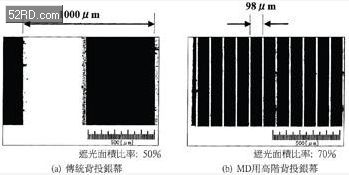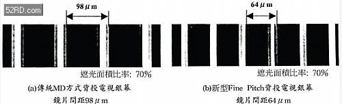 如上所述RP-TV用螢?zāi)煌ǔJ窃诿髁潦覂?nèi)環(huán)境中使用,對(duì)RP-TV螢?zāi)欢宰钄嗍覂?nèi)外亂光提高影像對(duì)比(Contrast)非常重要。影像光線穿透時(shí)不會(huì)被遮光部遮蔽的前提下,通常開(kāi)口部的面積越小,亦即遮光部的面積比率越大,遮蔽外亂光的能力越強(qiáng),影像對(duì)比也越高。