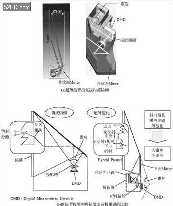 2000年日本三洋發(fā)表厚33cm、50吋背投電視,2002年三菱電機(jī)推出厚度只有23cm背投電視(圖八),該公司也于2004年突破20cm門檻,一般認(rèn)為未來(lái)背投電視的厚度可望媲美電漿電視。背投電視薄型化的結(jié)果,業(yè)者必需開(kāi)發(fā)特殊離軸型LenticularLensScreen與FresnelLensScreen。