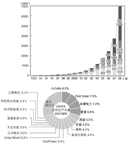 - 全球太陽電池產(chǎn)量急增, 2008年比上年大幅成長了87%,達到6941MW