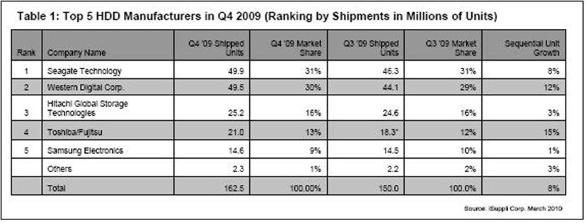 iSuppli公司預(yù)計(jì)希捷在2010年第一季度將保持榜首位置,而西部數(shù)據(jù)仍將緊隨其后。