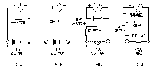 如圖1d所示,在表頭上并聯(lián)和串聯(lián)適當(dāng)?shù)碾娮瑁瑫r(shí)串接一節(jié)電池,使電流通過(guò)被測(cè)電阻,根據(jù)電流的大小,就可測(cè)量出電阻值。改變分流電阻的阻值,就能改變電阻的量程。