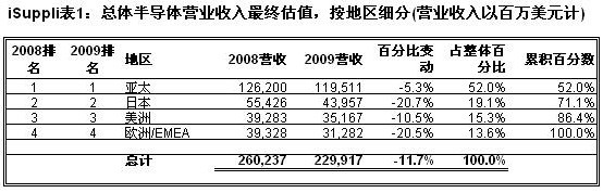 表1所示為iSuppli公司對2009年各地區(qū)半導(dǎo)體營業(yè)收入的最終估計。