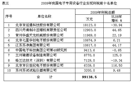 2009年電子專用設(shè)備行業(yè)前十名銷售收入總額達(dá)到64.3億元,占全行業(yè)銷售收入的69.9(2006年為61% 2007年為63.9% 2008年為66.5%),比2008年的前十名銷售收入增長17.14%。入圍前十名的銷售收入也從2008年的2.82億元提高到2009年的3.13億元。中國電子科技集團(tuán)公司第四十八研究所,2009年在太陽能設(shè)備和太陽能電池片的推動下得到了快速的發(fā)展,總銷售收入達(dá)到15.3億元,繼續(xù)位居行業(yè)的首位。