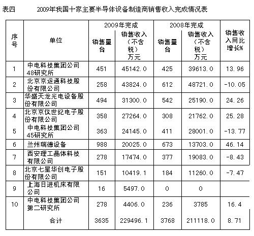 2009年我國十家主要半導(dǎo)體設(shè)備制造商完成的半導(dǎo)體設(shè)備總銷售收入(不含稅)達(dá)到22.95億元,同比增長了8.71%。半導(dǎo)體設(shè)備出口交貨值為4127.4萬元,同比下降了31.2%。