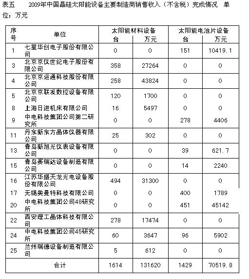 2009年下半年在光伏產(chǎn)業(yè)市場的推動下,我國晶硅太陽能設(shè)備得到迅速復(fù)蘇,2009年我國主要太陽能電池制造商太陽能設(shè)備銷售收入比2008年增長了14.44%,達(dá)到20.21億元。其中:太陽能級晶硅生長和加工設(shè)備增長7.34%,達(dá)到13.16億元,占太陽能電池設(shè)備銷售收入的65.1﹪(2008年為69.4%);晶硅太陽能電池芯片制造設(shè)備增長30.56%,達(dá)到7.05億元,占太陽能電池設(shè)備銷售收入的34.9﹪。