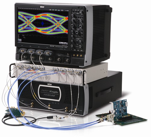 在RX測試時,示波器通過GPIB接口控制RF Switch切換到另一鏈路,如圖8下部分所示,PeRT3的碼型發(fā)生器輸出的加入抖動的信號先通過Compliance Test Channel(由Intel的11英寸背板和3米USB3.0電纜組成),然后連接到USB3夾具,進入PUT的RX端,PUT的TX端通過夾具,把信號發(fā)送給PeRT3的Error Dector端。