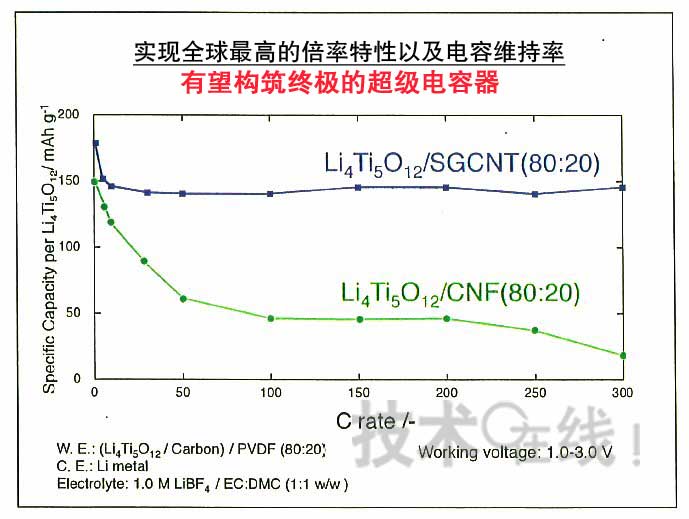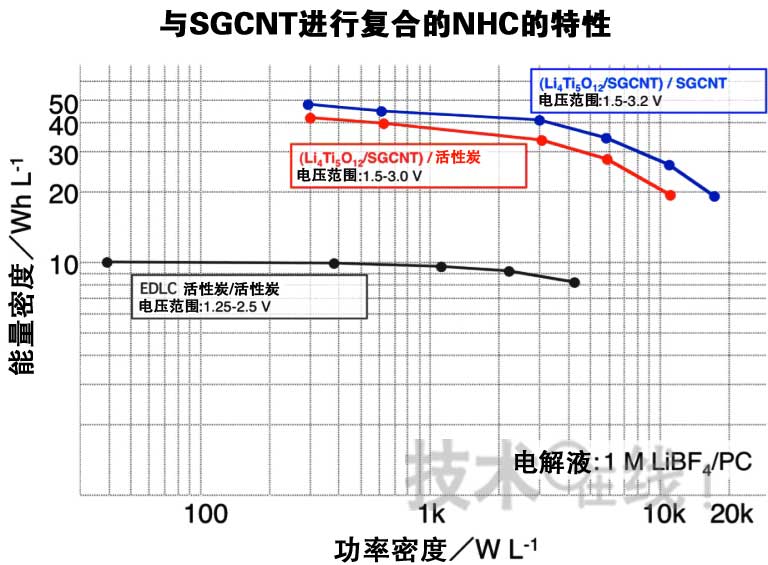 圖1:特性得到提高。綠線表示采用SGCNT、紅線表示采用活性炭作為正極材料時(shí)的特性