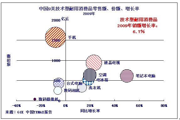 2009年,中國(guó)技術(shù)型耐用消費(fèi)品零售總額8442億元(按1美元=6.82元人民幣計(jì)算,為1238億美元),比2008年增長(zhǎng)6.7%。這一數(shù)字略低于2008年的同比增長(zhǎng)率7.7%,但是,考慮到中國(guó)經(jīng)濟(jì)經(jīng)歷了2008年末開(kāi)始的經(jīng)濟(jì)危機(jī)、2009年上半年的前景不確定性等不利因素,2009年中國(guó)技術(shù)型耐用消費(fèi)品市場(chǎng)還是交出了一份令人比較滿(mǎn)意的答卷。