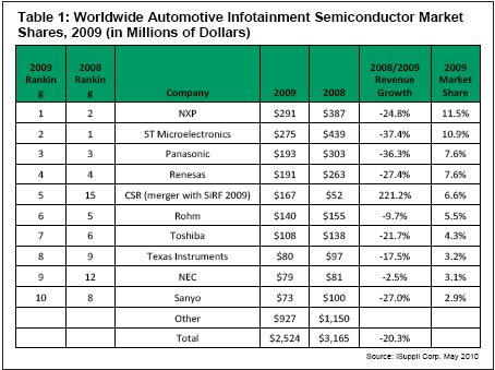 恩智浦半導(dǎo)體(NXP)2009年在全球汽車(chē)信息娛樂(lè)半導(dǎo)體市場(chǎng)排名第一,這是iSuppli公司從2005年開(kāi)始追蹤該市場(chǎng)以來(lái)的第一次。