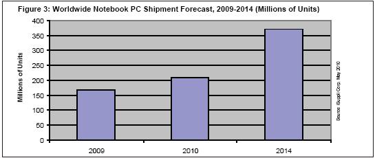 在筆記本電腦的三大領(lǐng)域中,上網(wǎng)本2010年出貨量將達(dá)到3450萬(wàn)臺(tái),比2009年增長(zhǎng)30%。到2014年,上網(wǎng)本出貨量預(yù)計(jì)將達(dá)5830萬(wàn)臺(tái)。上網(wǎng)本是尺寸較小的筆記本,屏幕尺寸小于10.2英寸,價(jià)格低于500美元。