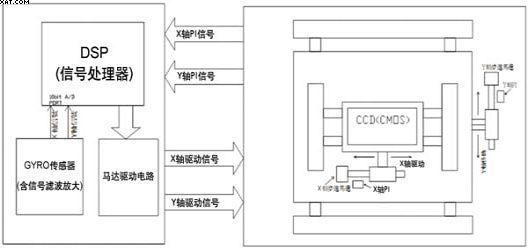 由圖2看出,在3D圖面上,Z軸有自動聚焦功能,Z軸移動對成像基本沒有影響,有影響是在X軸(PITCH)與Y軸(YAW)。圖4為在晚上拍照,無防手抖與有CCD防手抖的結(jié)果。圖5為CCD防抖系統(tǒng)框架,CCD防抖是在鏡頭上增加CCD支架,利用步進馬達對X軸,Y軸的驅(qū)動,使CCD移動來補償CCD的抖動。MEMS陀螺儀選用要有X,Y軸Gyro芯片,內(nèi)部含放大,低通,高通濾波,這樣可以大大減少相機的尺寸。Gyro信號連DSP的ADport,DSP的AD是10bit,滿足設(shè)計要求。資料運算用相機本身的DSP處理,可以減少一微處理器(Micro),降低成本。DSP對Gyro傳來的ω信息進行運算,計算補償量,通過馬達驅(qū)動電路驅(qū)動X,Y移動來達到補償?shù)哪康?。X軸,Y軸的PI信號是Lens反饋DSP信息來校正CCD與Lens中心重合,避免補償過程超出Lens設(shè)計的補償范圍。