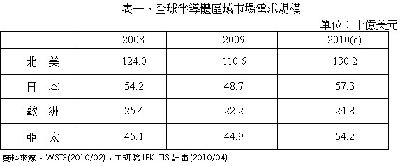 2009年全球半導(dǎo)體市場(chǎng)僅北美地區(qū)微幅成長(zhǎng)1.7%,其他皆呈現(xiàn)負(fù)成長(zhǎng):亞太市場(chǎng)衰退3.5%,歐洲市場(chǎng)衰退21.9%,日本市場(chǎng)衰退21.0%。不景氣使得下游電子產(chǎn)品品牌大廠,如Dell、HP、Sony等廠商增加產(chǎn)品委外代工之比例,以降低生產(chǎn)成本,增加其產(chǎn)品競(jìng)爭(zhēng)力。因此,2009年主要從事代工生產(chǎn)之亞太地區(qū),才會(huì)出現(xiàn)僅小幅衰退之情形。至于北美地區(qū)則是因?yàn)槭艿较掠纹放茝S商降價(jià)促銷(xiāo)成功,使得市場(chǎng)呈現(xiàn)小幅成長(zhǎng)。