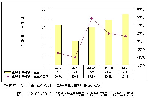 金融風(fēng)暴使得全球廠商皆大幅減少資本支出金額,以保存手中之現(xiàn)金,度過(guò)此波不景氣。 2009年全球半導(dǎo)體資本支出為259億美元,較2008年429億衰退39.6%。然而,在看好今年歐美主要消費(fèi)市場(chǎng)需求之復(fù)蘇,以及新興市場(chǎng)需求力道可望持續(xù)下,2010年全球半導(dǎo)體廠商將提高資本支出達(dá)407億美元規(guī)模,較2009年大幅成長(zhǎng)57.1%。其中,全球記憶體廠商大幅提高資本支出,以提升其先進(jìn)制程水準(zhǔn),是主要?jiǎng)恿χ弧?br />