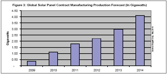 2010年合同制造商將生產(chǎn)1.1GW的太陽能電池板,比2009年時(shí)的369MW大增200%。其余的生產(chǎn)任務(wù)將由專門的太陽能電池板廠商以及其它企業(yè)承擔(dān)。2014年合同制造商生產(chǎn)的太陽能電池板將比2010年增長近三倍,達(dá)到4.1GW。