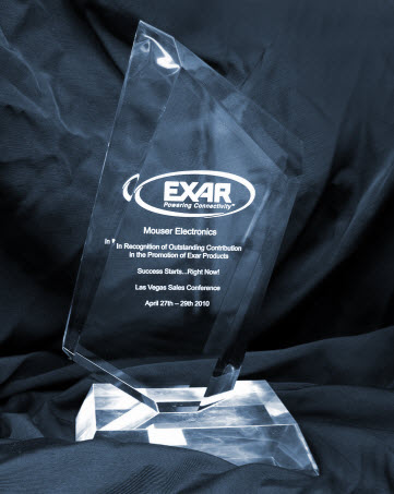在2010年4月拉斯維加斯召開(kāi)的Exar銷售大會(huì)上,Exar 為表彰在Exar產(chǎn)品宣傳中的杰出貢獻(xiàn)向Mouser Electronics頒發(fā)杰出貢獻(xiàn)獎(jiǎng)。Mouser獲此殊榮的理由是其成功地在過(guò)去的16個(gè)月內(nèi)保持每月的銷售量都有巨大的增長(zhǎng)。 Mouser同時(shí)還通過(guò)網(wǎng)絡(luò)和目錄營(yíng)銷手段向數(shù)千名新客戶推介Exar的電源管理擴(kuò)展陣列,通信以及接口硅晶解決方案。