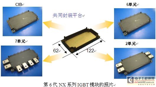 第6代NX系列IGBT模塊產(chǎn)品豐富,包括1200V和1700V兩個(gè)電壓等級,額定電流從35A到1000A,分別有CIB (Converter Inverter Brake)、七單元、六單元、二單元和一單元模塊,共5種電路拓?fù)洹H盗挟a(chǎn)品采用同一封裝平臺從而降低了模塊的制造成本,使得NX系列IGBT模塊的性價(jià)比具有不同尋常的競爭力。