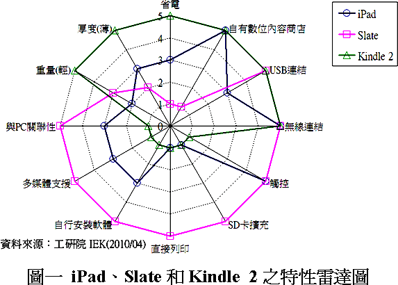 工研院IEK進行iPad、Slate和Kindle 2三種產(chǎn)品有關(guān)省電、自有數(shù)位內(nèi)容商店、USB連結(jié)、無線連結(jié)、觸控、SD卡擴充、直接列印、自行安裝軟體、多媒體支援、與PC關(guān)聯(lián)性、重量(輕)和厚度(薄)等特性的競比,1分代表不具有其特性,為最低比重,分數(shù)越高代表與此特性關(guān)聯(lián)性越強,完全相關(guān)聯(lián)為最高5分,將其結(jié)果繪制成雷達圖(圖一)表示。