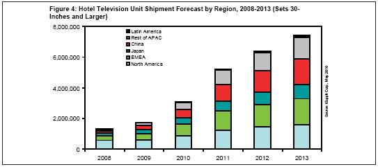預(yù)計(jì)2013年酒店電視出貨量將從2009年的170萬臺(tái)增長到740萬臺(tái)(譯者注:從此處看,是增長“近四倍”),復(fù)合年度增長率為55%。此處出貨量是指尺寸大于或等于30英寸的酒店客房電視出貨量。