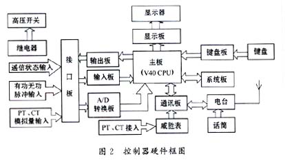 該終端控制器的硬件結(jié)構(gòu)如圖2所示,它的主體是一臺STD工控機(jī),采用模板式結(jié)構(gòu),便于故障檢修。供電線路的電壓、電流經(jīng)PT、CT變換后經(jīng)A/D轉(zhuǎn)換板轉(zhuǎn)變?yōu)閿?shù)字信號送至V40主板,PT、CT變比經(jīng)主臺設(shè)定后下發(fā)至該終端,CPU據(jù)此計(jì)算出線路的實(shí)際電壓、電流。脈沖電度表發(fā)出的脈沖信號經(jīng)輸入板送至CPU,根據(jù)電表脈沖常數(shù)計(jì)算出有功及無功功率。KG105型電臺接收主臺下發(fā)的指令,經(jīng)通訊板送至CPU,然后由輸出板控制輸出繼電器的動作,進(jìn)而實(shí)現(xiàn)遙控跳合閘操作。遠(yuǎn)程抄表是由電臺經(jīng)通訊板采集威勝表中的數(shù)據(jù)實(shí)現(xiàn)的,而召測數(shù)據(jù)則是采集CPU中計(jì)算出的數(shù)據(jù)。CPU每隔1min采集1次數(shù)據(jù),所有計(jì)算結(jié)果保存在系統(tǒng)板上的SRAM中,可保存24小時(shí)的數(shù)據(jù),因此主臺第二天必須將第一天的數(shù)據(jù)召測回中心站的數(shù)據(jù)庫中,否則第一天的數(shù)據(jù)將丟失。