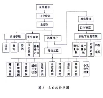 該無線電力負(fù)荷控制系統(tǒng)的管理軟件是用面向?qū)ο蟮木幊坦ぞ遃isualBasic6.0開發(fā)完成的,系統(tǒng)軟件框圖如圖3所示。系統(tǒng)啟動后要求輸入操作員工號及口令,驗(yàn)證無誤后連接電臺,進(jìn)入主窗體。