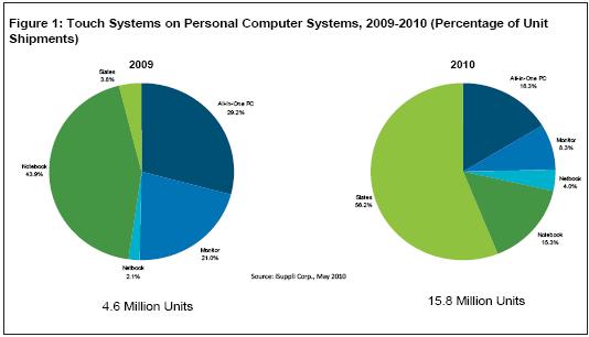 最近幾年,個(gè)人電腦市場(chǎng)對(duì)于觸摸屏的需求不斷增長(zhǎng),2008和2009年增長(zhǎng)率超過20%,快于總體系統(tǒng)市場(chǎng)。但與該市場(chǎng)2010年462%的增長(zhǎng)率相比,上述增長(zhǎng)速度就相形見絀了。平板觸摸電腦是PC觸摸革命中的主要初期推動(dòng)者,預(yù)計(jì)占PC觸摸市場(chǎng)的比例將從2009年的3.8%銳升到56.2%,而總體PC觸摸市場(chǎng)規(guī)模將擴(kuò)大兩倍。