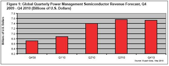 2010年第一季度,電源管理半導(dǎo)體銷售收入達(dá)到69億美元,比2009年第四季度的67億美元增長(zhǎng)2.9%。該市場(chǎng)在2009年第三季度曾陷入停滯,第四季度開(kāi)始擴(kuò)張,第一季度數(shù)據(jù)顯示該市場(chǎng)仍在擴(kuò)張。