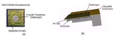 傳統(tǒng)ECM是一個金屬罐,由一層可移動的永久充電振膜和一塊與之平行的剛性背板以及場效應晶體管(FET)構成。聲波使振膜彎曲,改變振膜和背板之間的氣隙間距,從而使振膜和背板之間的電容發(fā)生改變,這種改變以電壓變化的形式輸出,可反映出進入聲波的頻率和幅度。