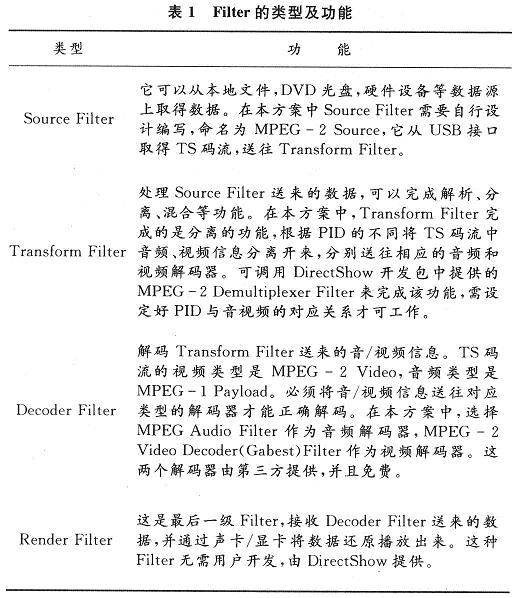 軟件方面,PC機端應(yīng)用程序的核心部分是實時播放器,需要播放的是TS碼流,這是MPEG-2標(biāo)準(zhǔn)定義的一種碼流。本方案采用基于DirectShow技術(shù)搭建的媒體播放器。DirectShow是DirectX家族中的成員,它為在Windows平臺上處理各種格式的多媒體文件的回放、音視頻采集等高性能要求的多媒體應(yīng)用提供了完整的解決方案,重要的是它很好地支持了MPEG-2標(biāo)準(zhǔn),它使應(yīng)用程序開發(fā)人員從復(fù)雜的數(shù)據(jù)傳輸、硬件差異、同步性等工作解脫出來,總體應(yīng)用框架和底層工作由DirectShow來完成,大大加快了開發(fā)進度。