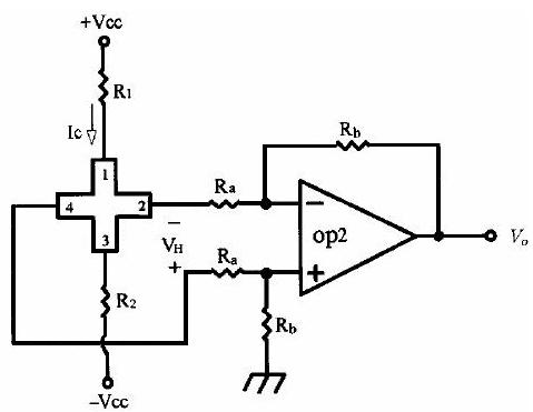 磁場(chǎng)強(qiáng)度可利用形成在結(jié)晶片的一部份的霍爾組件變換成電氣信號(hào)(參照前述霍爾組件的作用原理)。結(jié)晶通常使用半導(dǎo)體硅,霍爾組件的磁場(chǎng)靈敏度為10~20mV/K.Oe。此信號(hào)經(jīng)形成在同一結(jié)晶中的信號(hào)處理電路放大后,作為適合所定目的的信號(hào)電壓被取出。通常四根導(dǎo)線中的兩根連接于一方接地的電源,而從剩下的兩根的一根取出正極性的信號(hào)電壓,并從另一根取出負(fù)極性的信號(hào)電壓。霍爾組件的輸入電阻通常需符合信號(hào)處理電路的電源,以便可利用定電壓使用霍爾組件。此時(shí)組件的輸出電壓不管在N型或P型均無大差異。又因輸出電壓與電子或正孔的移動(dòng)度成正比,故溫度特性也應(yīng)該盡量保持一定,這是與單體霍爾組件不同的地方。