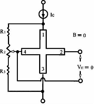 圖2系表示3~5端子之霍爾組件的使用方法,在三端子霍爾元件之輸出可以產(chǎn)生輸入端子電壓之大致一半與輸出信號(hào)電壓之和的電壓,而在四端子及五端子霍爾組件中,在原理上雖然可以免除輸入端子電壓的影響,但實(shí)際上即使在無磁場(chǎng)時(shí),也有起因于組件形狀之不平衡等因素之不平衡電壓存在。
